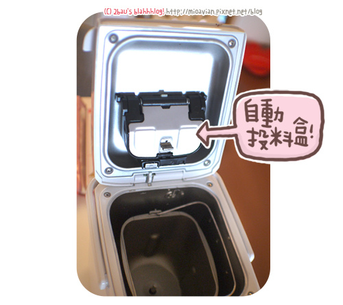 這台麵包機有自動投料功能哦! 選擇自動行程,時間到了盒子會自動打開,把所放的材料加到麵團裡了喔! 不必再自己動手了。
