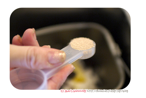 接著把材料全部放進麵包機容器,最後放入酵母粉。酵母粉記得要在麵粉上挖個洞再放進去喔! 因為鹽和糖提早接觸到酵母粉的話是會影響酵母粉的功用的。